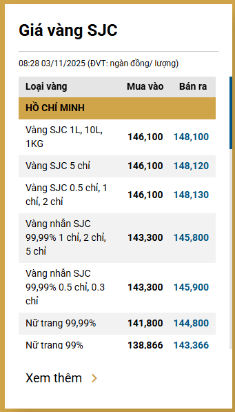 Sáng ngày 3/11, Công ty Vàng bạc đá quý Sài Gòn niêm yết giá vàng SJC ở mức 146,10-148,10 triệu đồng/lượng (mua vào-bán ra).