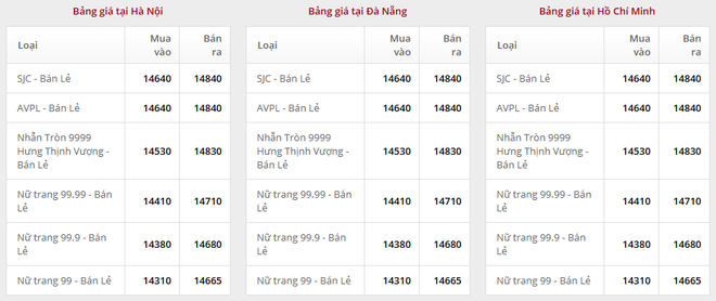 Giá vàng tại Công ty Trách nhiệm hữu hạn Một thành viên Vàng bạc đá quý Sài Gòn (SJC):