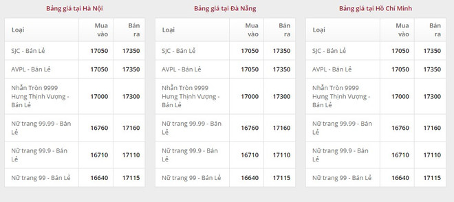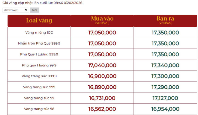 Giá vàng tại Công ty Cổ phần Đầu tư vàng Phú Quý: