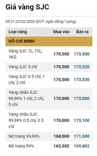 Tại Việt Nam, sáng 3/2, giá vàng SJC tại thị trường Hà Nội được Công ty Vàng bạc đá quý Sài Gòn niêm yết ở mức 163-166 triệu đồng/lượng (mua vào-bán ra).