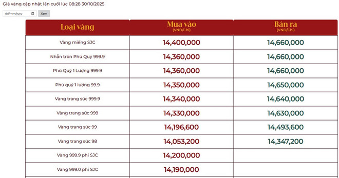 Dưới đây là bảng giá vàng tại một số công ty vàng bạc đá quý trong nước sáng 30/10: