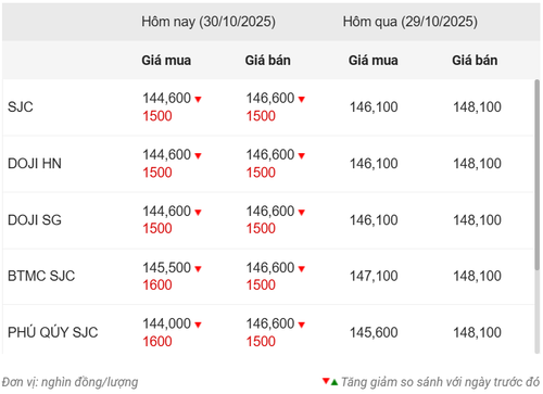 Cụ thể, tại thời điểm 10 giờ 30 phút ngày 30/10, Công ty Vàng bạc đá quý Sài Gòn (SJC) niêm yết giá vàng miếng SJC mua vào-bán ra ở mức 144,6-146,6 triệu đồng/lượng, giảm 1,5 triệu đồng mỗi lượng ở cả chiều mua vào và chiều bán ra so chốt phiên hôm trước. Chênh lệch mua-bán ở mức 2 triệu đồng.