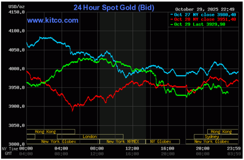 Tính đến 10 giờ 30 phút ngày 30/10 (giờ Việt Nam), giá vàng thế giới giảm 21,25 USD/ounce so kết phiên hôm trước xuống mức 3.929,9 USD/ounce.