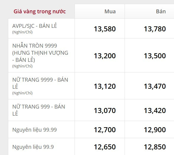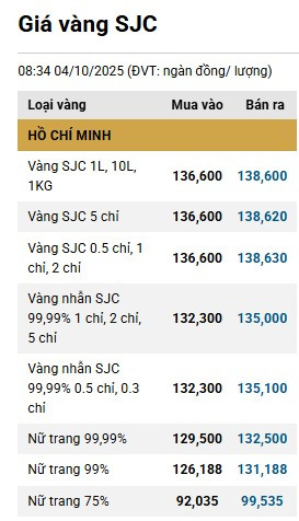 Tại Việt Nam, sáng 4/10, Công ty Vàng bạc đá quý Sài Gòn (SJC) niêm yết giá vàng miếng ở mức 135,8-137,8 triệu đồng/lượng (mua vào-bán ra).