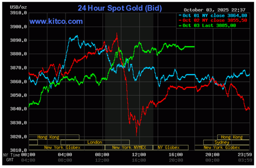 Tính đến 10 giờ 30 phút ngày 4/10 (giờ Việt Nam), giá vàng thế giới tăng 29,5 USD/ounce so kết phiên hôm trước lên mức 3.885 USD/ounce.