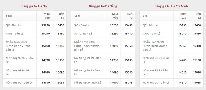 Giá vàng tại Công ty Cổ phần Đầu tư vàng Phú Quý: