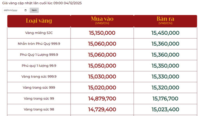 Dưới đây là bảng giá vàng tại một số công ty vàng bạc đá quý trong nước sáng 4/12: