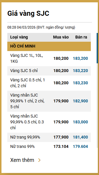 Tại Việt Nam, sáng 4/3, giá vàng SJC được Công ty Vàng bạc đá quý Sài Gòn niêm yết ở mức 180,20-183,20 triệu đồng/lượng (mua vào-bán ra).