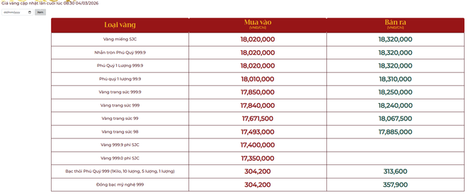 Dưới đây là bảng giá vàng tại một số công ty vàng bạc đá quý trong nước sáng 4/3: