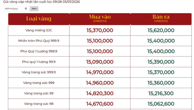Dưới đây là bảng giá vàng tại một số công ty vàng bạc đá quý trong nước sáng 5/1: