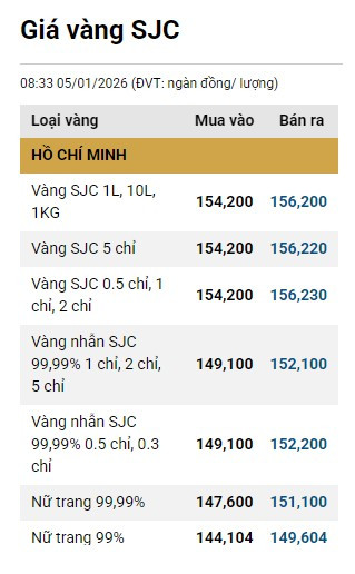 Tại Việt Nam, sáng 5/1, giá vàng SJC tại thị trường Hà Nội được Công ty Vàng bạc đá quý Sài Gòn niêm yết ở mức 150,8-152,8 triệu đồng/lượng (mua vào-bán ra).