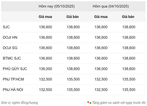 Cụ thể, tại thời điểm 9 giờ sáng 5/10, Công ty Vàng bạc đá quý Sài Gòn (SJC) niêm yết giá vàng miếng SJC mua vào-bán ra ở mức 136,6-138,6 triệu đồng/lượng. Chênh lệch mua-bán 2 triệu đồng/lượng.