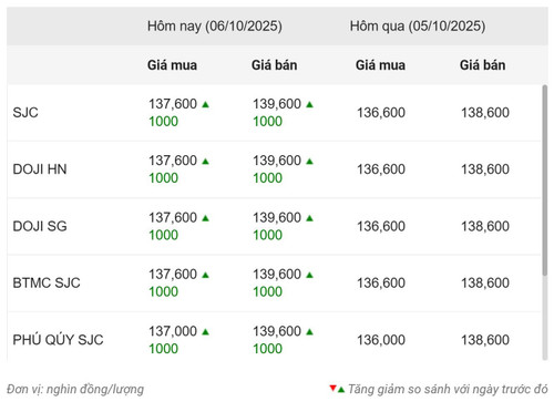 Cụ thể, tại thời điểm 12 giờ ngày 5/10, Công ty Vàng bạc đá quý Sài Gòn (SJC) niêm yết giá vàng miếng SJC mua vào-bán ra ở mức 137,6-139,6 triệu đồng/lượng, tăng 1 triệu đồng so kết phiên trước đó. Chênh lệch mua-bán 2 triệu đồng/lượng.