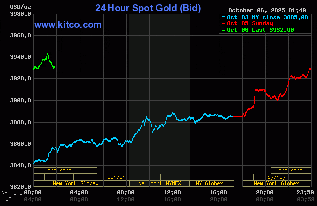 Tính đến 12 giờ ngày 6/10 (giờ Việt Nam), giá vàng thế giới tăng 47 USD so chốt phiên trước đó lên mức 3.932 USD/ounce.