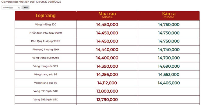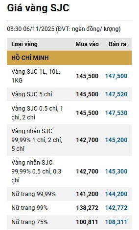 Tại Việt Nam, vào đầu giờ sáng 6/11, Công ty Vàng bạc đá quý Sài Gòn niêm yết giá vàng SJC ở mức 145,5-147,5 triệu đồng/lượng (mua vào-bán ra).
