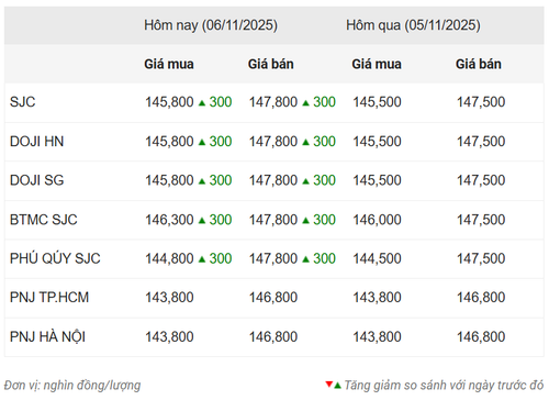 Cụ thể, tại thời điểm 13 giờ 30 phút ngày 6/11, Công ty Vàng bạc đá quý Sài Gòn (SJC) niêm yết giá vàng miếng SJC mua vào-bán ra ở mức 145,8-147,8 triệu đồng/lượng, tăng 300 nghìn đồng mỗi lượng ở cả chiều mua vào và chiều bán ra so chốt phiên hôm trước. Chênh lệch mua-bán ở mức 2 triệu đồng.