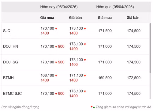 Cụ thể, tại thời điểm 12 giờ 30 phút ngày 6/4, Công ty Vàng bạc đá quý Sài Gòn (SJC) niêm yết giá vàng miếng SJC mua vào-bán ra ở mức 170,1-173,1 triệu đồng/lượng, giảm 1,4 triệu đồng so cuối tuần trước. Chênh lệch mua-bán 3 triệu đồng/lượng.