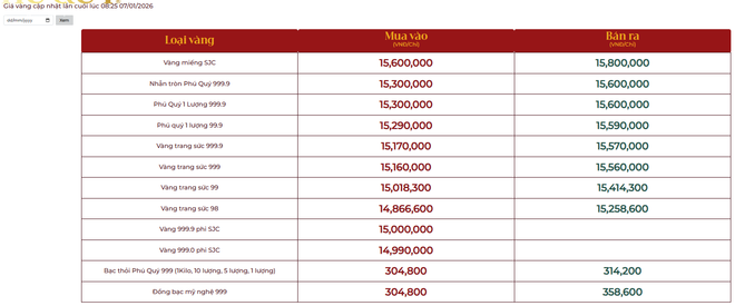 Tại Việt Nam, sáng 7/1, giá vàng SJC tại thị trường Hà Nội được Công ty Vàng bạc đá quý Sài Gòn niêm yết ở mức 156,00-158,00 triệu đồng/lượng (mua vào-bán ra).
