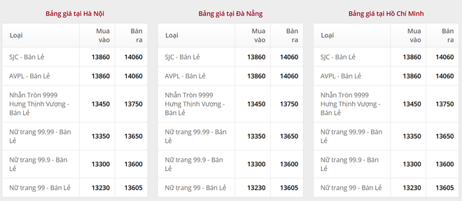 Giá vàng tại Công ty Trách nhiệm hữu hạn Một thành viên Vàng bạc Đá quý Sài Gòn (SJC):
