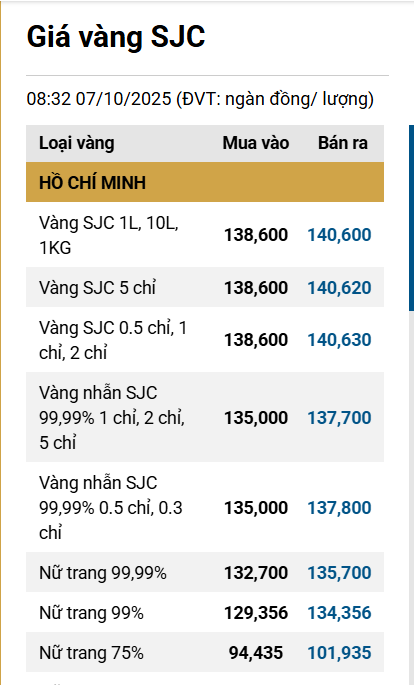 Tại Việt Nam, sáng 7/10, Công ty Vàng bạc đá quý Sài Gòn (SJC) niêm yết giá vàng miếng ở mức 138,6-140,6 triệu đồng/lượng (mua vào-bán ra).