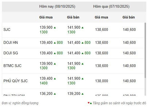 Cụ thể, tại thời điểm 10 giờ 30 phút ngày 8/10, Công ty Vàng bạc đá quý Sài Gòn (SJC) niêm yết giá vàng miếng SJC mua vào-bán ra ở mức 139,9-141,9 triệu đồng/lượng, tăng 1,3 triệu đồng/lượng. Chênh lệch mua-bán 2 triệu đồng/lượng.