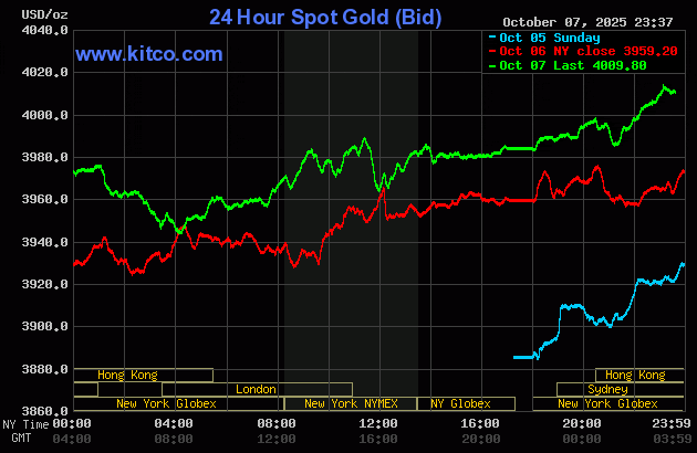 Tính đến 9 giờ sáng 8/10 (giờ Việt Nam), giá vàng thế giới tăng 50,6 USD so chốt phiên trước đó lên mức 4.009,8 USD/ounce.