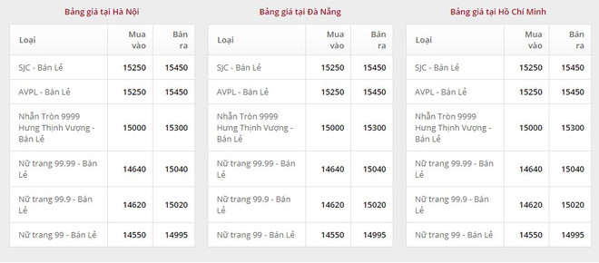 Giá vàng tại Công ty Trách nhiệm hữu hạn Một thành viên Vàng bạc đá quý Sài Gòn (SJC):