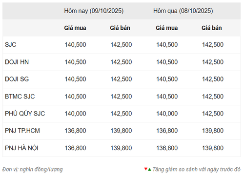 Cụ thể, tại thời điểm 12 giờ 30 phút ngày 9/10, Công ty Vàng bạc đá quý Sài Gòn (SJC) niêm yết giá vàng miếng SJC mua vào-bán ra ở mức 140,5-142,5 triệu đồng/lượng, giữ nguyên ở cả chiều mua vào và chiều bán ra so chốt phiên hôm trước. Chênh lệch mua-bán ở mức 2 triệu đồng.