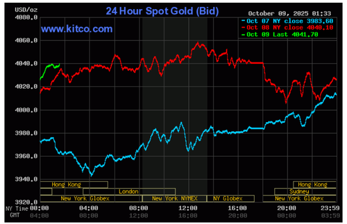 Tính đến 12 giờ 30 phút ngày 9/10 (giờ Việt Nam), giá vàng thế giới tăng nhẹ 1,6 USD/ounce so kết phiên hôm trước lên mức 4.041,7 USD/ounce.