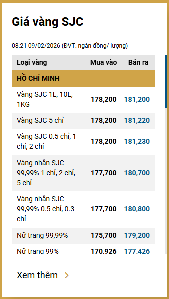 Tại Việt Nam, sáng 9/2, giá vàng SJC tại thị trường Hà Nội được Công ty Vàng bạc đá quý Sài Gòn niêm yết ở mức 178,20-181,20 triệu đồng/lượng (mua vào-bán ra).