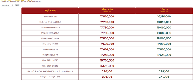 Dưới đây là bảng giá vàng tại một số công ty vàng bạc đá quý trong nước sáng 9/2: