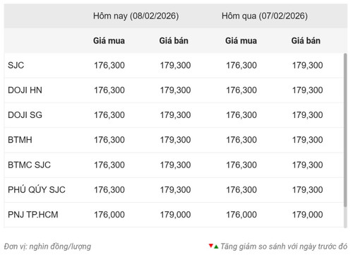 Cụ thể, tại thời điểm 20 giờ 30 phút ngày 8/2, Công ty Vàng bạc đá quý Sài Gòn (SJC) niêm yết giá vàng miếng SJC mua vào-bán ra ở mức 176,3-179,3 triệu đồng/lượng, tăng 6,7 triệu đồng so cuối tuần trước. Chênh lệch mua-bán 3 triệu đồng/lượng.