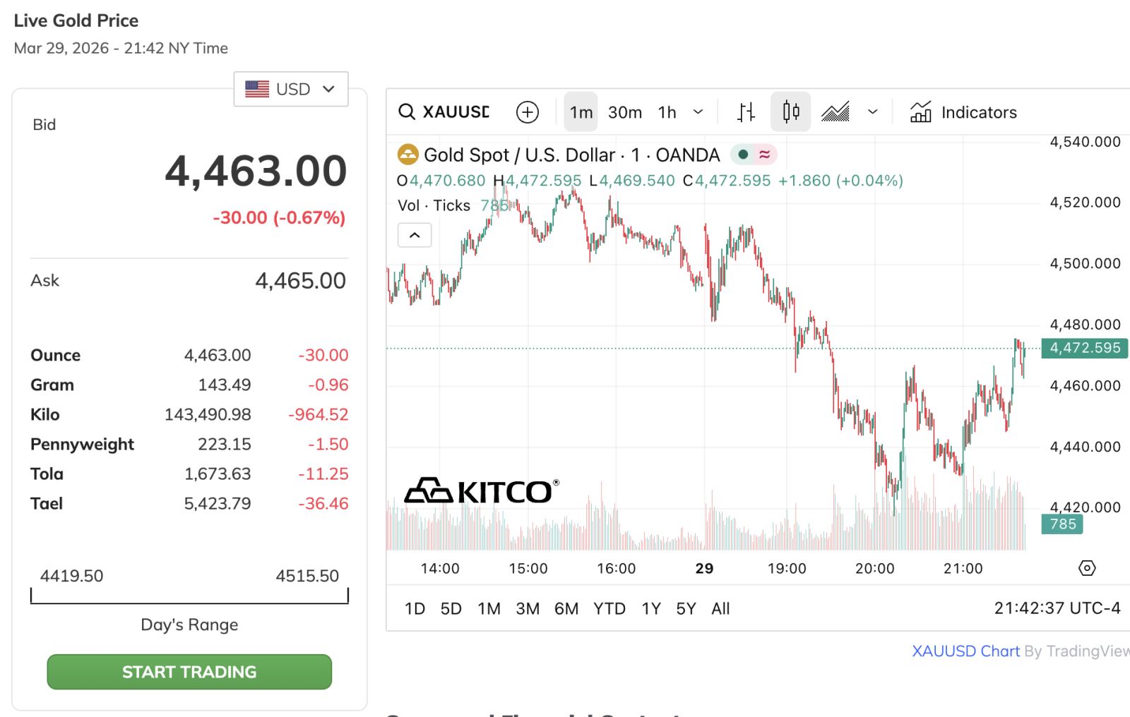 Giá vàng giao dịch tối ngày 29/3 tại sàn giao dịch New York. Ảnh chụp màn hình từ Kitco