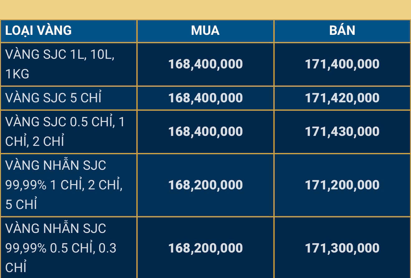 Cụ thể, vào lúc 6 giờ sáng, giá vàng miếng SJC được các doanh nghiệp như DOJI, Bảo Tín Minh Châu và Phú Quý niêm yết ở mức 169,8 - 172,8 triệu đồng/lượng (mua vào - bán ra). Tuy nhiên, đến 9 giờ sáng, giá vàng miếng SJC được điều chỉnh giảm xuống còn khoảng 168,4 - 171,4 triệu đồng/lượng, giảm khoảng 1,4 triệu đồng/lượng ở cả hai chiều mua vào và bán ra.