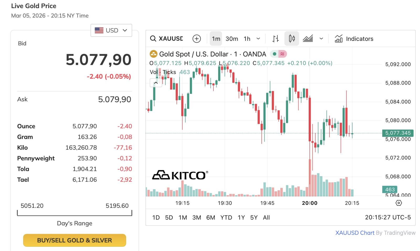 Theo dữ liệu từ Kitco.com, trong phiên giao dịch lúc 8 giờ 15 phút ngày 6/3 (giờ Việt Nam), giá vàng giao ngay ở mức 5.077,90 USD/ounce, giảm 2,40 USD, tương đương 0,05% so với phiên trước đó. Trong phiên, giá vàng dao động trong khoảng 5.051,20 – 5.195,60 USD/ounce, cho thấy biên độ biến động lớn dù xu hướng chung chịu áp lực giảm.
