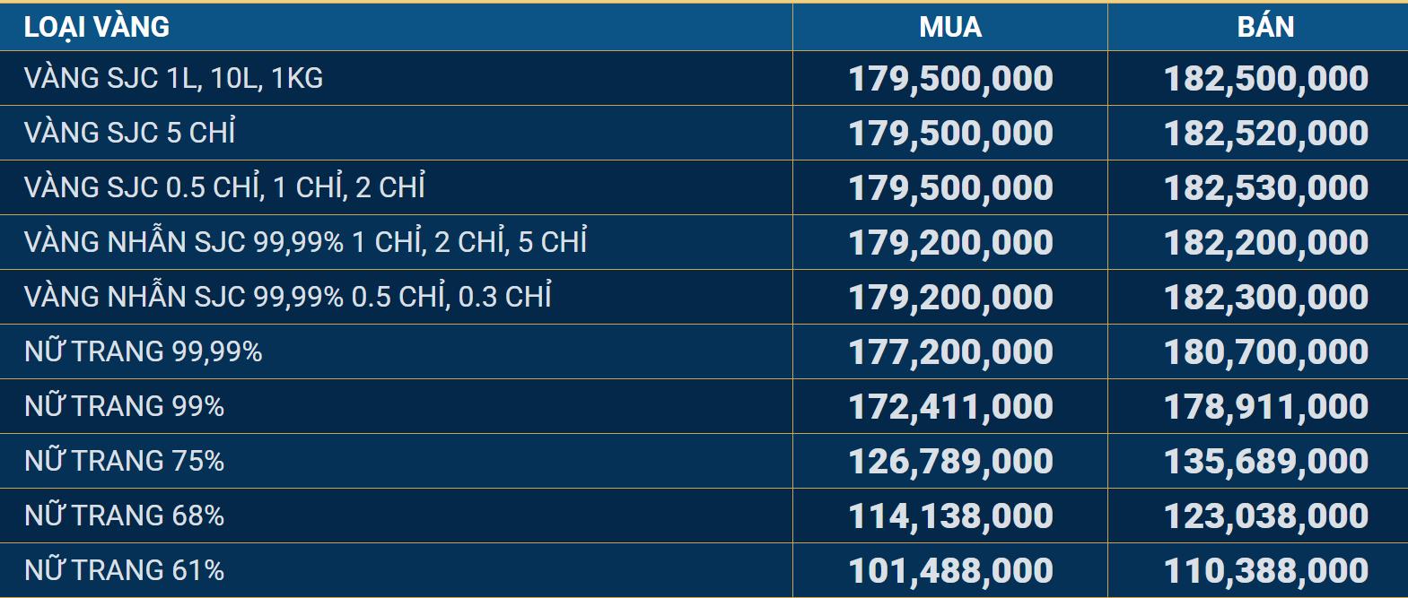 Theo bảng giá chi tiết tại TP Hồ Chí Minh, các loại vàng SJC đang được niêm yết như sau: Vàng SJC 1L, 10L, 1KG: mua vào 179,50 triệu đồng/lượng, bán ra 182,50 triệu đồng/lượng. Vàng SJC 5 chỉ: mua vào 179,50 triệu đồng/lượng, bán ra 182,52 triệu đồng/lượng. Vàng SJC 0,5 chỉ, 1 chỉ, 2 chỉ: mua vào 179,50 triệu đồng/lượng, bán ra 182,53 triệu đồng/lượng.