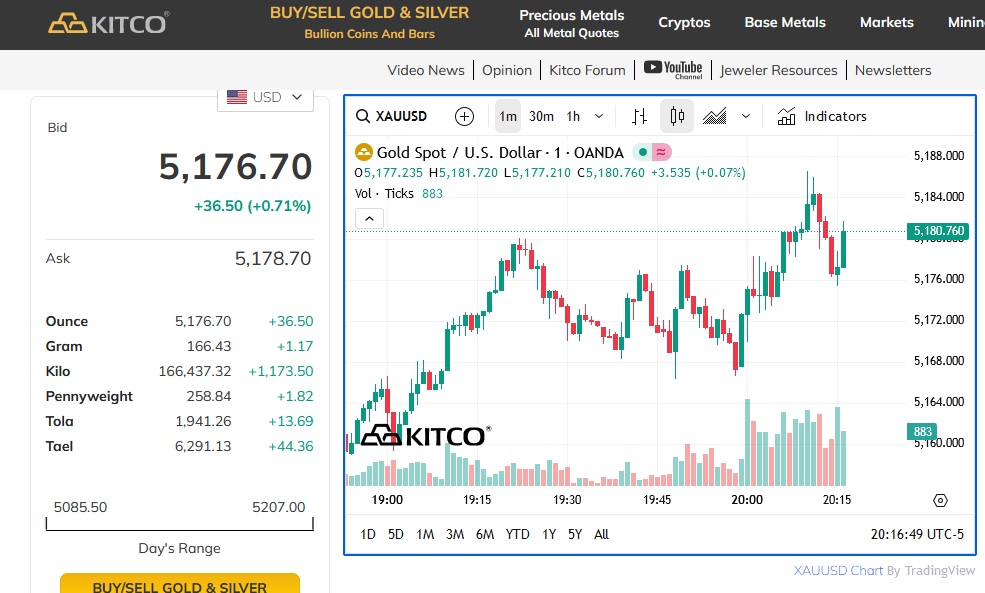 Trên thị trường giao dịch New York (Mỹ) vào lúc 8 giờ 20 phút sáng 2/3 (theo giờ Việt Nam), giá vàng giao ngay đã chạm mốc 5.179,6 USD, tăng 0,77%. Trước đó, kim loại quý này từng lập kỷ lục 5.594,82 USD/ounce ngày 29/1.