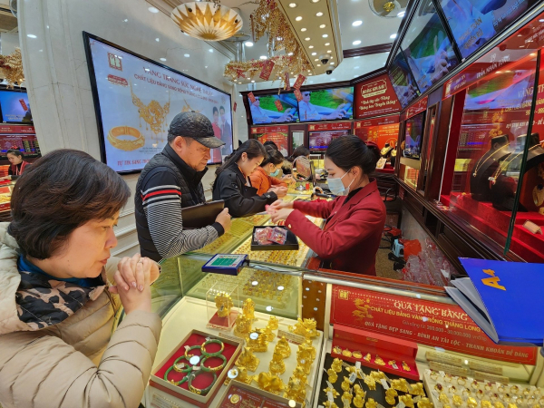 Chịu tác động từ giá vàng thế giới, giá vàng trong nước đã bật tăng ngay lúc mở cửa. Theo đó, giá vàng miếng SJC được các doanh nghiệp giao dịch ở mức 157,8 – 159,8 triệu đồng/lượng (mua vào – bán ra). Như vậy, chỉ còn 200 nghìn đồng nữa thôi, giá vàng sẽ đạt đỉnh 160 triệu đồng/lượng - mức giá cao nhất mọi thời đại. Với mức giá này, so với lúc mở cửa đầu năm, mỗi lượng vàng đã tăng thêm 76 triệu đồng.
