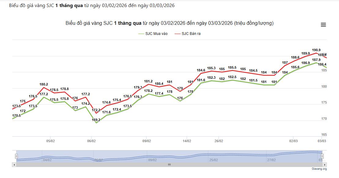 Tại thị trường trong nước, lúc 8 giờ 45 phút ngày 3/3, giá vàng SJC được niêm yết phổ biến ở mức 187,9 triệu đồng/lượng (mua vào) và 190,9 - 190,93 triệu đồng/lượng (bán ra), tăng 3,9 triệu đồng/lượng so với phiên trước.