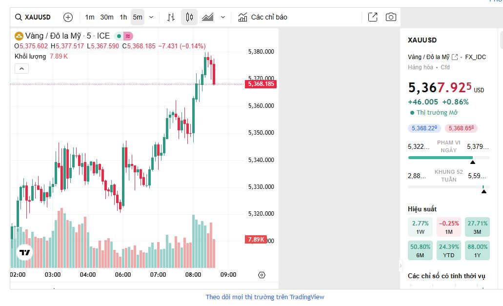 Biên độ dao động trong phiên khá rộng, từ 5.263,20 - 5.419,60 USD/ounce cho thấy lực mua chiếm ưu thế nhưng áp lực chốt lời vẫn xuất hiện khi giá tiến sát vùng đỉnh.