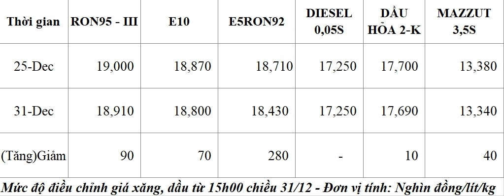 Giá xăng dầu mới được liên Bộ Công Thương - Tài chính thông báo điều chỉnh từ 15h00 chiều nay (31/12). Theo đó, giá xăng RON95-III là 18.910 đồng/lít, giảm 90 đồng/lít; Giá xăng E10 là 18.800 đồng/lít, giảm 70 đồng/lít; Giá xăng E5RON92 là 18.430 đồng/lít, giảm 280 đồng/lít.