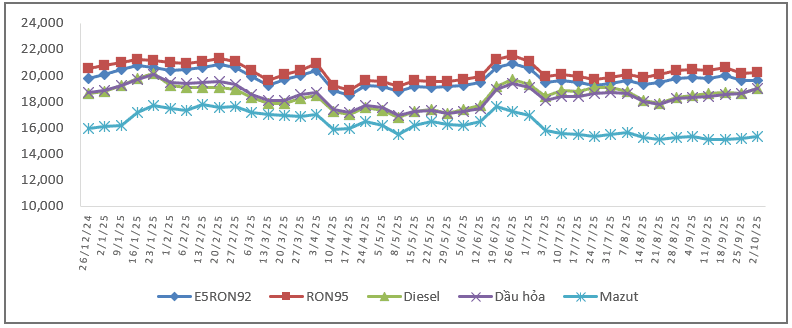 Bình quân giá thành phẩm xăng dầu thế giới giữa kỳ điều hành giá ngày 25/9 và 2/10: 78,716 USD/thùng xăng RON92 dùng để pha chế xăng E5RON92 (tăng 0,14%); 80,688 USD/thùng xăng RON95 (tăng 0,27%); 89,386 USD/thùng dầu hỏa (tăng 2,42%); 89,968 USD/thùng dầu diesel 0,05S (tăng 2,35%); 411,796 USD/tấn dầu mazut 180CST 3,5S (tăng 1,75%).