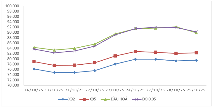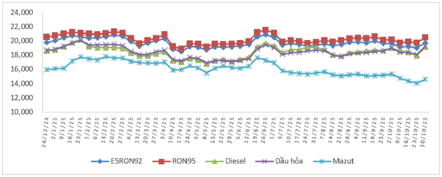 Biến động giá bán xăng dầu trong nước từ 26/12/2024 đến 30/10/2025.