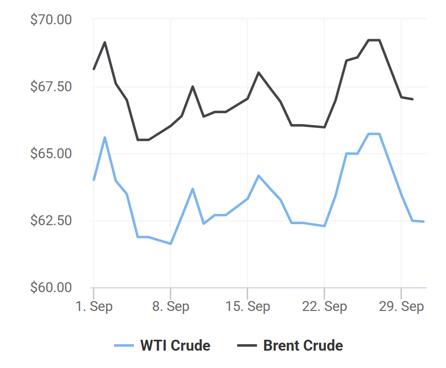 Trong sáng nay 1/10/2025, giá xăng dầu thế giới giảm khi thị trường chuẩn bị cho khả năng dư cung do OPEC+ có thể có kế hoạch tăng sản lượng lớn hơn vào tháng tới.