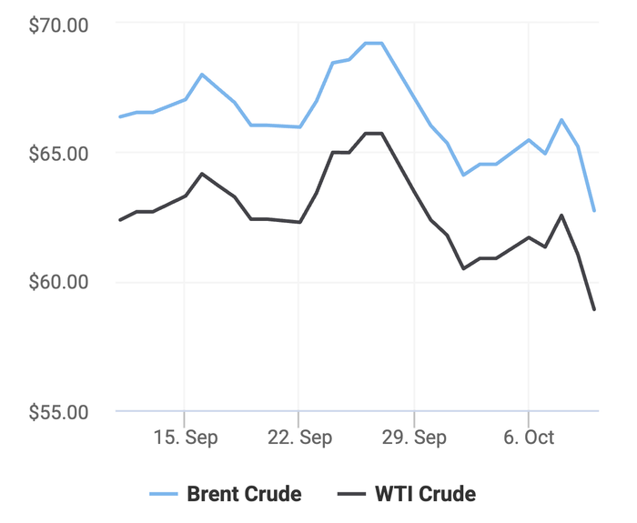 Giá xăng dầu hôm nay 11/10 trên thị trường thế giới lao dốc giảm mạnh, theo số liệu từ các sàn giao dịch dầu thô như Trading Economics và Oilprice.