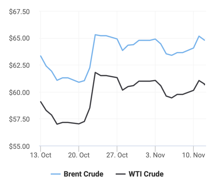 Do có sự biến động nên giá dầu bình quân tháng 11 so với tháng trước tăng 2,6% đến 2,9%. So với cùng kỳ năm trước, giá dầu thô vẫn suy giảm từ 9,3% đến trên 10%.