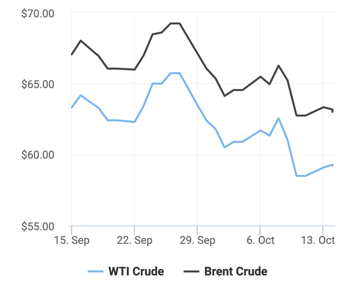 Xu hướng giá dầu thô Brent và giá dầu thô WTI trong 30 ngày gần đây. (Theo số liệu từ Oilprice)
