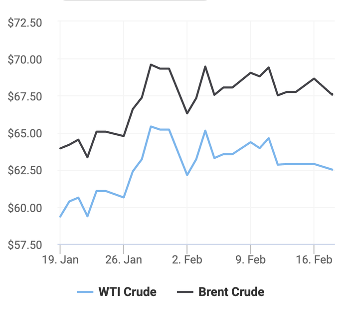 Tính đến 18/2, bình quân giá dầu thô tháng 2 tăng 3,2% đến 3,9% so với giá bình quân tháng trước. Trong khi đó so với cùng kỳ năm trước, giá dầu thô thế giới suy giảm từ 11% đến trên 13,2%.