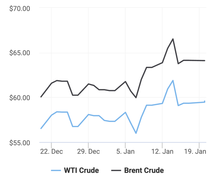 Giá xăng dầu hôm nay 20/1 trên thị trường thế giới tăng nhẹ, theo số liệu từ các sàn giao dịch dầu thô như Trading Economics và Oilprice.
