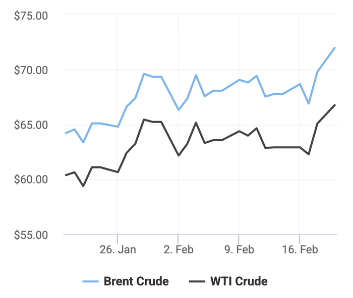 Giá xăng dầu hôm nay 20/2 trên thị trường thế giới tăng trở lại, theo số liệu từ các sàn giao dịch dầu thô như Trading Economics và Oilprice.